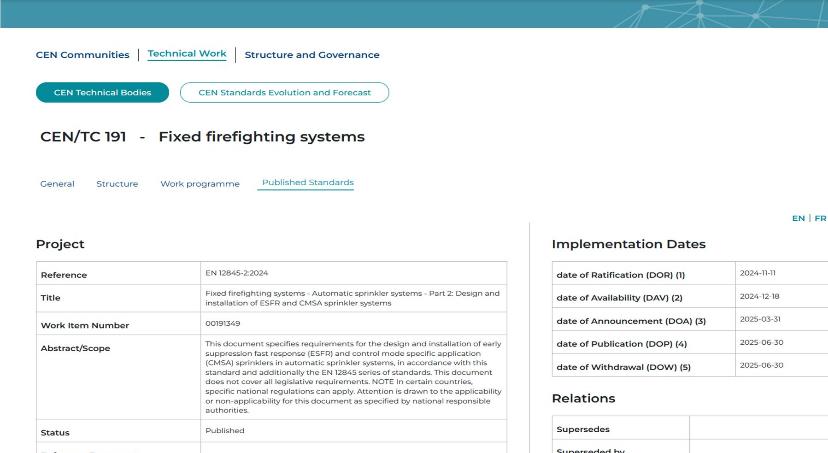 E’ stata pubblicata la nuova norma EN 12845-2:2024 Sistemi fissi antincendio - Sistemi sprinkler automatici - Parte 2: Progettazione e installazione di sistemi sprinkler ESFR e CMSA.